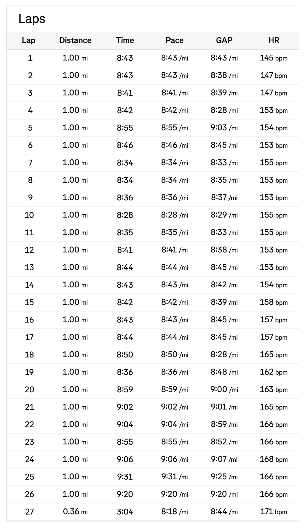 The above were my mile splits. Starting around mile 20 was when I started to slow down. Heart rate started creeping up too. I still had some left in the tank the last stretch though!