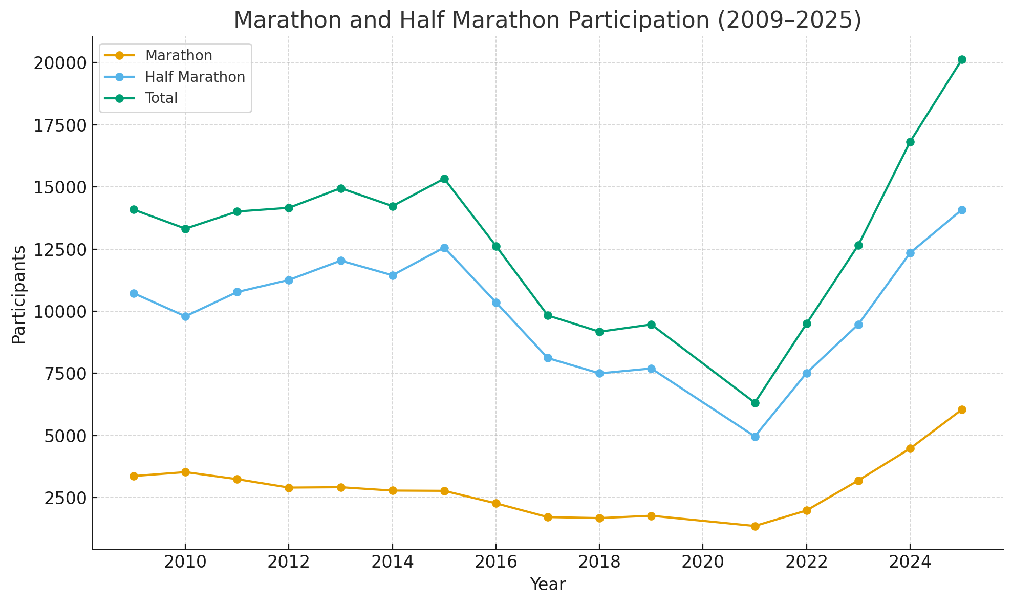 The graph below shows the number of half-marathon, marathon and total participants in the Long Beach races. You can see since the COVID 2020 year, the number of runners has gone up each year.